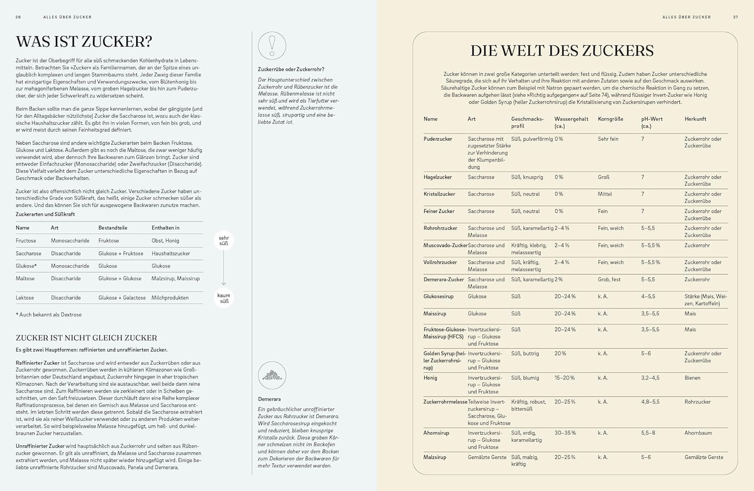 Die erste Hälfte des Buches ist den wichtigsten Bestandteilen eines Teiges – Mehl, Zucker, Eier, Fett – und Backtechniken gewidmet. Hier erfährt man alles über das Wie und Warum des Backens, sodass man sich nie wieder fragen muss, warum der Pudding geronnen, der Biskuit nicht aufgegangen oder die Panna Cotta nicht fest geworden ist.